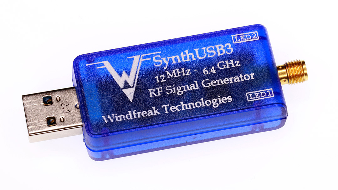 The SynthUSB3 operates between 12.5 MHz and 6.4 GHz and can be controlled and powered by any device running Windows, Linux, or Android via a USB port. Applications include wireless communications systems design, automated test equipment (ATE), and radiated immunity pre-compliance EMC testing.